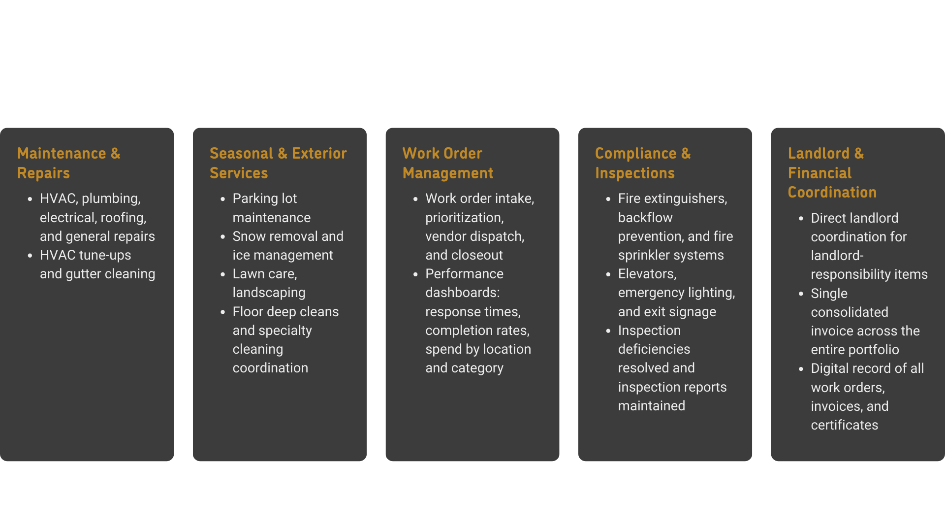 Facility Maintenance: Centralized maintenance oversight, landlord coordination, seasonal services management, and consolidated Accounts Payable.